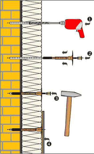 - Дюбелирование. Установка тарельчатых дюбелей, способствующих надежному удержанию материала.