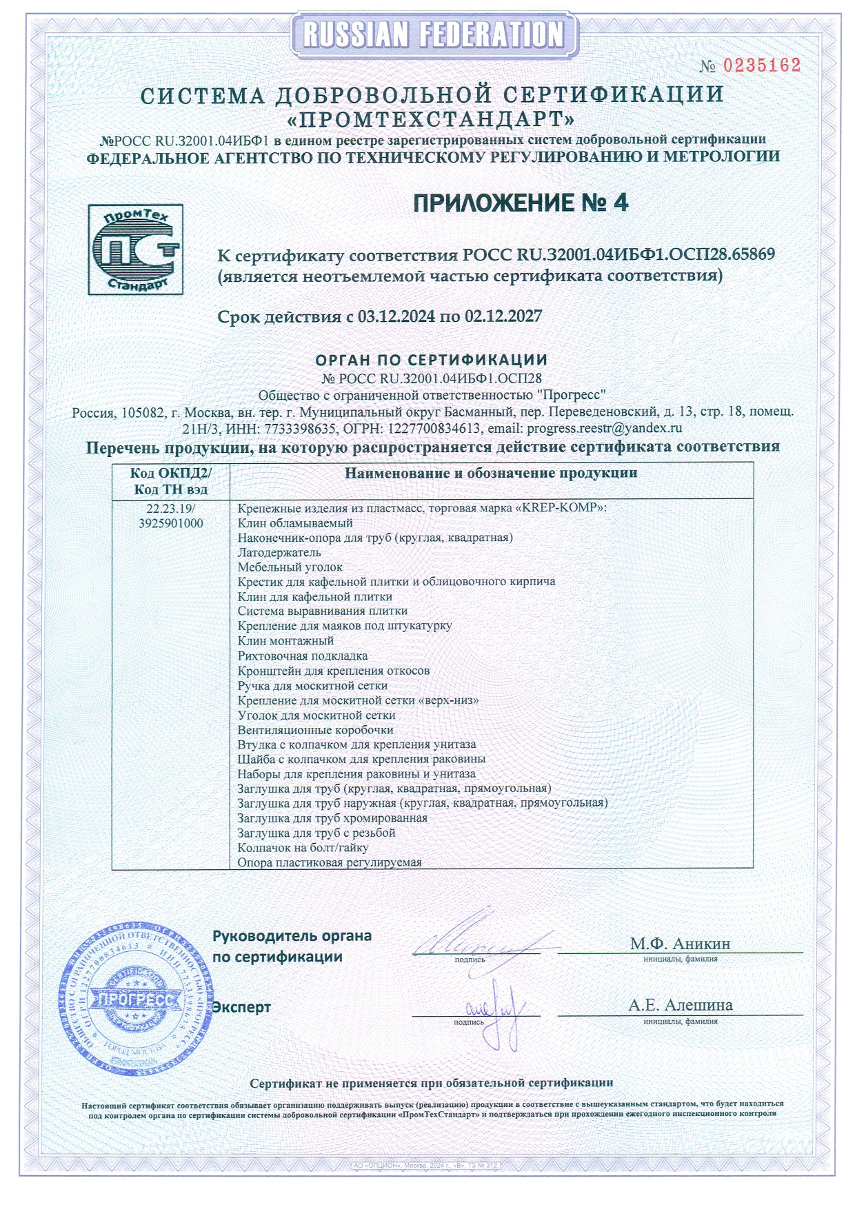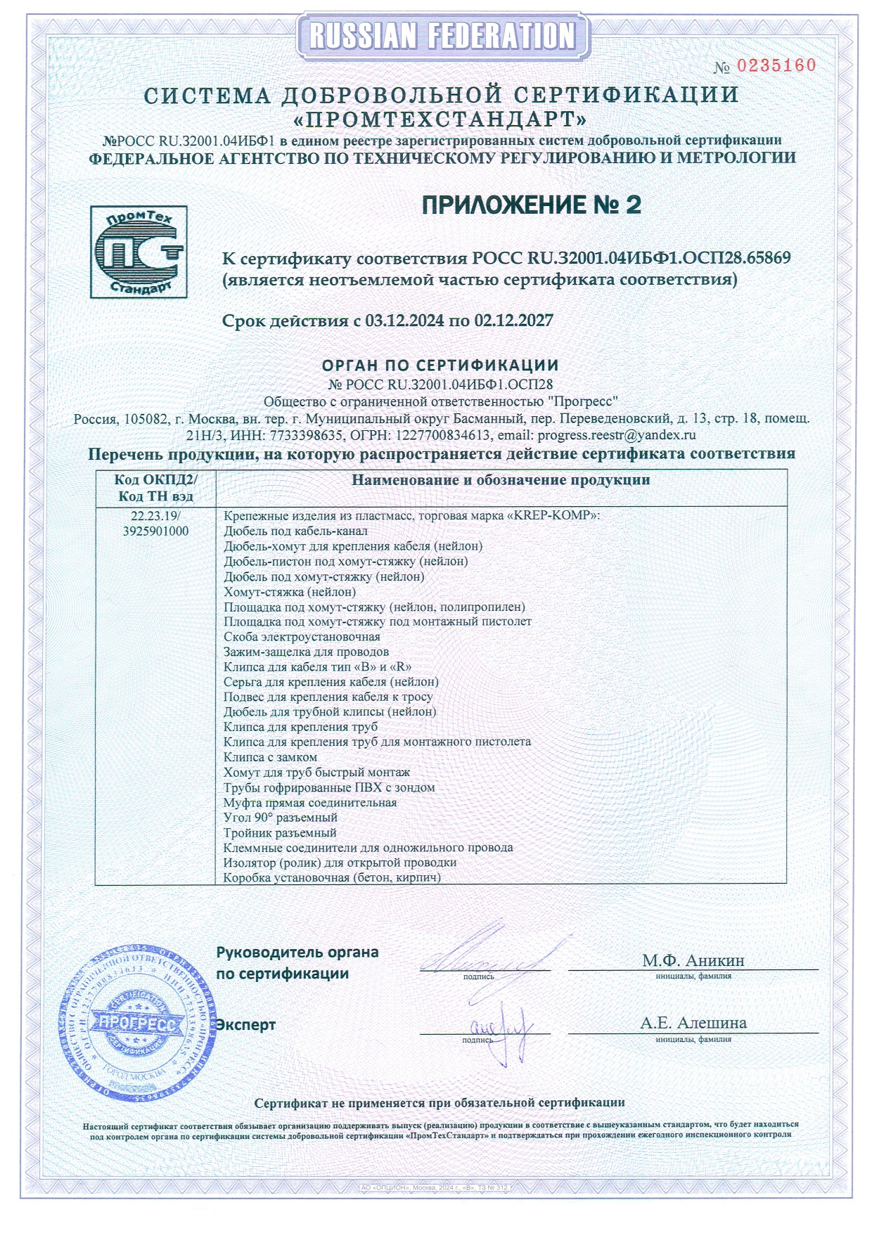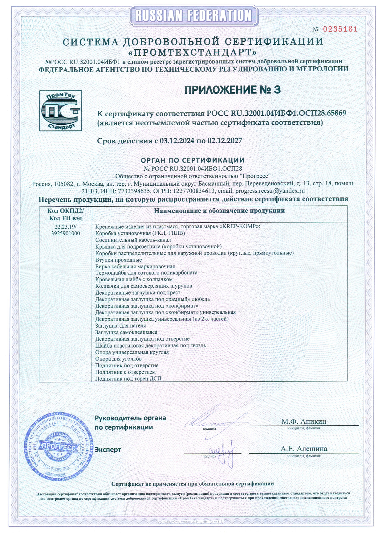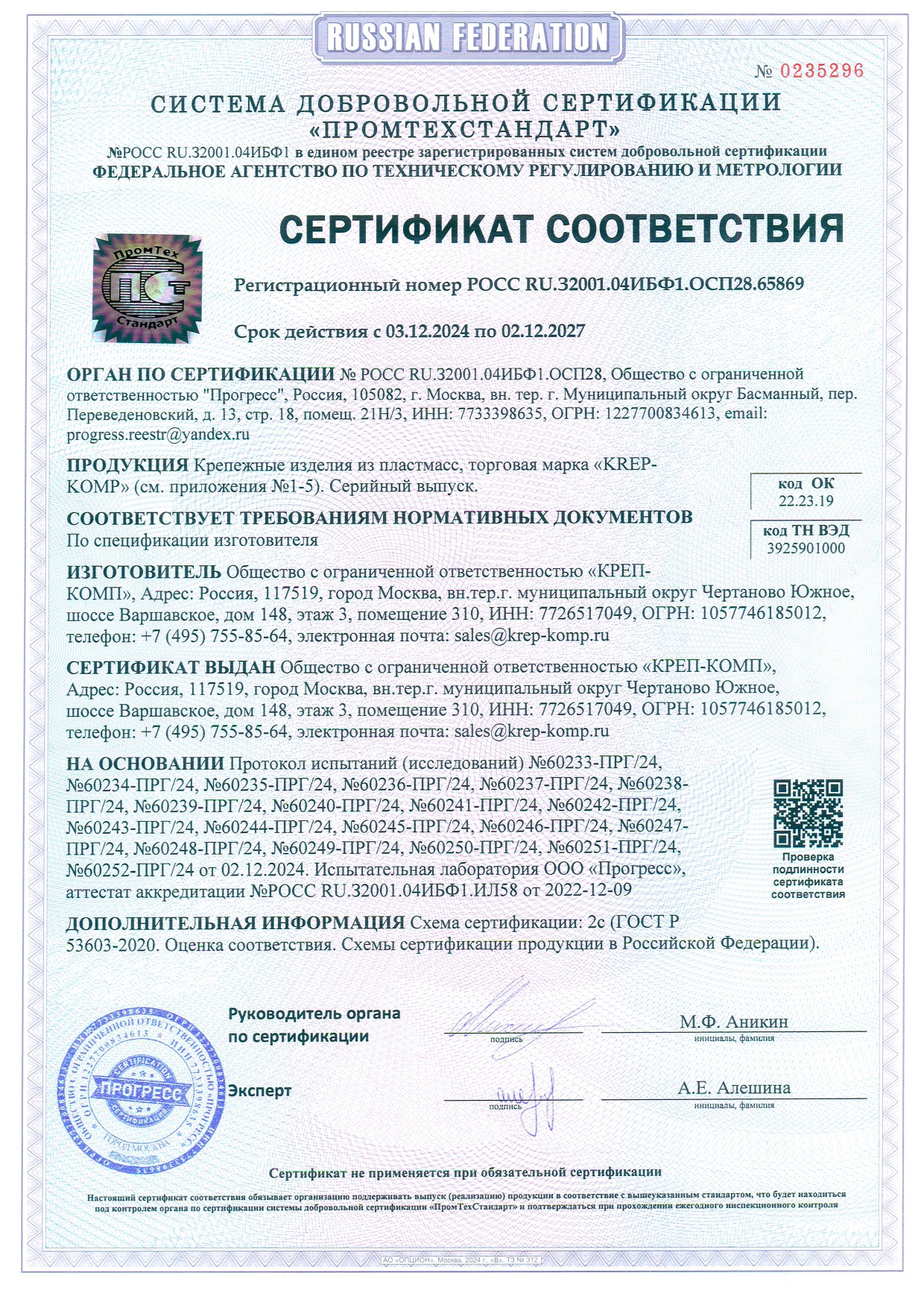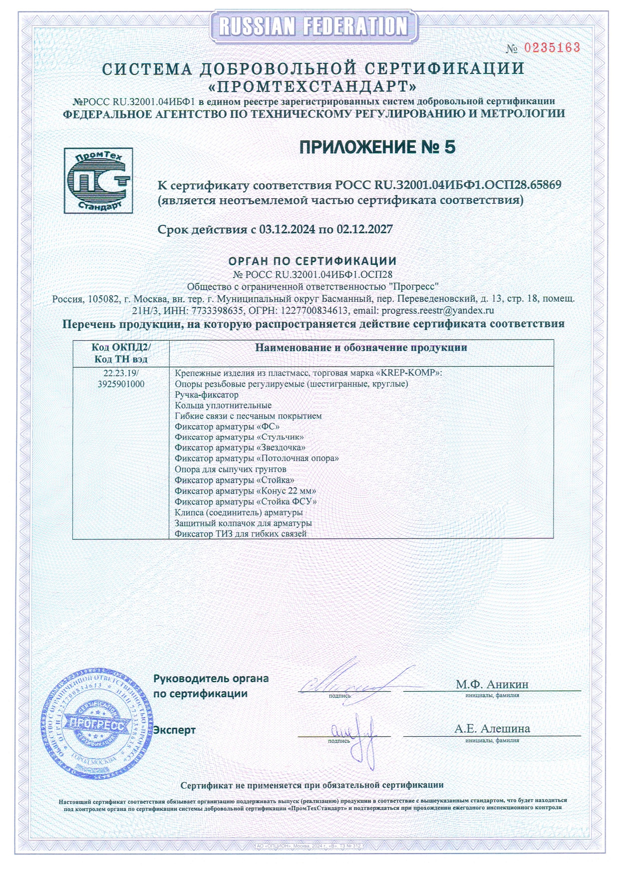 • Сертификат соответствия ФДКП с прессшайбой