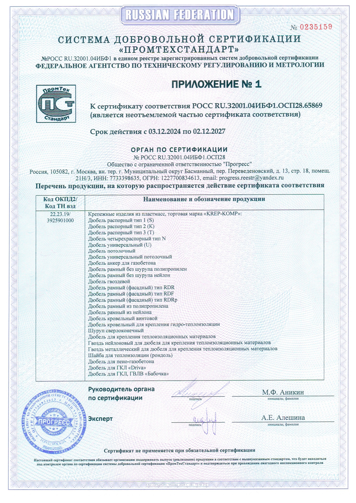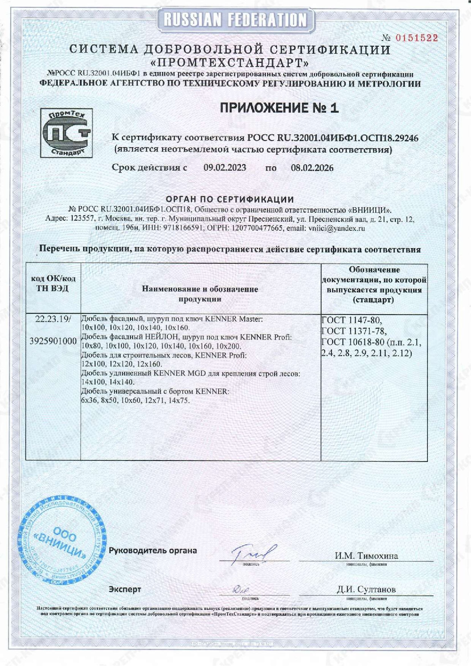 • Сертификат соответствия на дюбеля кровельные